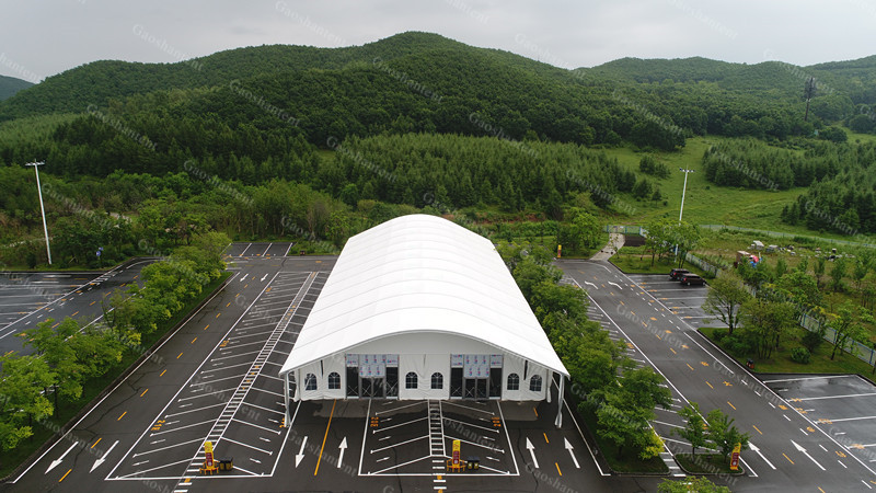 弧形篷房主要由經典的人字型篷房演變而來,端面由“A”變形為有弧度的線條,將篷頂斜梁進行預彎后達到的弧形效果頗具設計感,整體看起來十分流暢,遠看就像一座漂亮的彩虹屋。