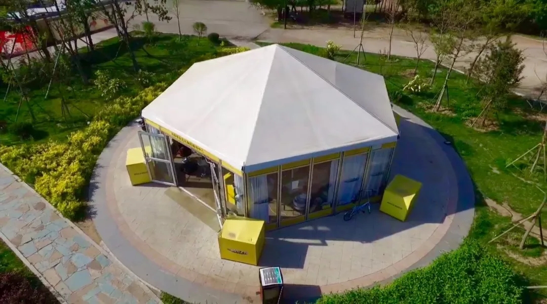 高山多邊形篷房邊高可達5米,頂高可達18米,直徑可以達50米,已經在跨國邊貿、展覽賽事、景區建設等領域得到了大范圍的應用。